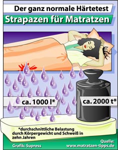 sup.- Klingt nach zuviel, ist aber ganz normal: Wer rund 3.000 Stunden jährlich im Bett verbringt, ist damit noch lange keine ausgesprochene Schlafmütze. Durchschnittlich „verschläft“ jeder Mensch rund ein Drittel seines Lebens. Obwohl Bett und Matratze damit zu den meiststrapazierten Möbelstücken in jedem Haushalt gehören, werden sie oft erst viel später ausgemustert als die Couchgarnitur oder der Wohnzimmerschrank. Dabei sind Zustand und Beschaffenheit der Schlafunterlage ganz besonders wichtig für eine gesunde und erholsame Nachtruhe. Spätestens nach zehn Jahren sollte kritisch geprüft werden, ob die alte Matratze nicht reif für die „Einschläferung“ auf dem Sperrmüll ist. Denn in diesem Zeitraum wird eine Matratze durchschnittlich durch rund 2.000 t Körpergewicht und ca. 2.000 l Schweiß belastet.