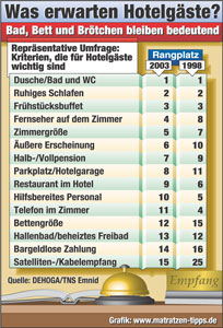 sup.- Nichts geht über ein entspannendes Bad, einen erholsamen Schlaf und ein gutes Frühstück. Die Gäste legen bei der Hotelauswahl mehr Wert auf eine gepflegte Grundausstattung als auf ausgefallene Angebote. Zu diesem Ergebnis kommt eine Studie des Bielefelder Instituts TNS Emnid. Im Auftrag des Deutschen Hotel- und Gaststättenverbandes (DEHOGA) sind rund 3.000 Hotelbesucher zu ihrer persönlichen Rangfolge bei den Ausstattungsmerkmalen befragt worden. Angebote wie der Fernseher auf dem Zimmer, die äußere Erscheinung und der Satelliten-/Kabelempfang gewannen in der Rangfolge zwar im Vergleich zu einer Befragung von 1998 deutlich an Gewicht, konnten dem Trio „Bad, Bett und Brötchen“ aber nicht die Plätze auf dem Siegertreppchen streitig machen.