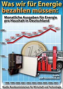sup.- Wärme, Wohnkomfort und motorisierte Beweglichkeit werden von den meisten Menschen längst als unverzichtbare Alltags-Normalität angesehen. Aber die Annehmlichkeiten der Neuzeit haben ihren Preis: Mehr als 95 Milliarden Euro – diese unglaubliche Summe wurde von den deutschen Verbrauchern allein im Jahr 2007 für Energie ausgegeben. Zum Vergleich: 1998 lagen die Gesamtausgaben der Deutschen für Kraftstoffe, Heizöl, Erdgas, Strom und andere Energieträger noch bei weniger als 70 Milliarden Euro. Für den einzelnen Verbraucher sind das abstrakte Beträge, die erst dann nachvollziehbar werden, wenn man sie auf die monatlichen Kosten pro Haushalt umrechnet: Dort stieg die finanzielle Belastung durch die Energiepreisentwicklung von 152 Euro im Jahr 1998 auf 197 Euro im Jahr 2007, innerhalb eines Zehn-Jahres-Zeitraums also um rund 30 Prozent.