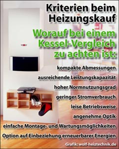 Eines ist zumindest sicher: Die früher einmal zutreffende Einschätzung, dass groß sein muss, was Leistung bringen soll, gilt längst nicht mehr. Moderne wandhängende Gas-Brennwertzentralen wie z. B. das Modell Wolf CGB decken bei äußerst kompakten Ausmaßen inzwischen einen Leistungsbereich von bis zu 100 kW ab. Aber die Kilowatt-Angabe ist natürlich nicht das einzige Qualitätskriterium einer Heizungsanlage. Entscheidend ist, dass diese Leistung mit einem möglichst geringen Einsatz von Brennstoff erzielt wird. Angesichts der stetig steigenden Energiepreise sollte also grundsätzlich der so genannte Normnutzungsgrad des Kessels auf den Prüfstand kommen. Was dabei nicht vergessen werden darf: Ein hoher Nutzungsgrad garantiert längst noch keine gute Energieeffizienz, wenn der Kessel gleichzeitig zu viel Strom verbraucht. Auch dieses Kriterium gehört deshalb zu einem seriösen Vergleich von Heizungsanlagen. Wichtig ist darüber hinaus die Kombinationsfähigkeit der Heizung mit einer Solaranlage oder eventuell mit einem Pelletheizkessel. Ob sofort oder als Option für später: Die Möglichkeit, erneuerbare Energien in die Wärmeerzeugung zu integrieren, sollte auf jeden Fall gegeben sein. Die Kessel des Systemanbieters Wolf Heiz- und Klimatechnik gehen hier mit gutem Beispiel voran: Sie sind von vornherein als möglicher Bestandteil der so genannten Wolf-Sonnenheizung ausgelegt, einem Gesamtkonzept optimal aufeinander abgestimmter Einzelkomponenten.