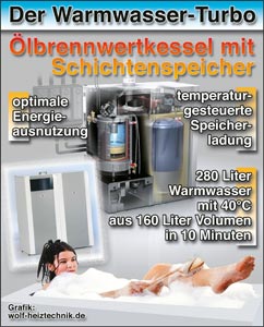 Es gibt allerdings noch ein weiteres Qualitätskriterium für Ölheizkessel, das angesichts der steigenden Brennstoffkosten einen immer wichtigeren Stellenwert bekommen wird: Wie effizient wird das Brennwert-Potenzial auch bei der Warmwasserbereitung in Bad und Küche ausgenutzt? Schließlich ist dies im Gegensatz zur Raumheizung eine Wärme-Aufgabe, die trotz besserer Gebäudedämmung nicht kleiner wird. Auch hier setzt der siegreiche Wolf-Kessel Maßstäbe, vor allem im Doppelpack mit dem Schichtenspeicher CS. Im Inneren dieses optisch dem Kessel angeglichenen Gerätes arbeitet ein neues Leit- und Verteilsystem für warmes und kaltes Wasser. Die Regelung der jeweiligen Speicherladung erfolgt temperaturgesteuert und damit optimiert für die Brennwerttechnik. Auf diese Weise können bei einem Speicherinhalt von 160 Litern innerhalb von nur zehn Minuten 280 Liter Wasser auf 40°C erwärmt werden. Selbst nach dem Befüllen einer Badewanne steht also sofort wieder ausreichend warmes Wasser zur Verfügung.