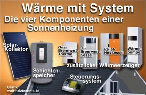 Die vierte, in ihrer Bedeutung oft unterschätzte Komponente der Anlage ist ein intelligentes Steuerungssystem, welches das sinnvolle Zusammenspiel der einzelnen Elemente überhaupt erst ermöglicht. Es gibt Hersteller wie den Systemanbieter Wolf Heiz- und Klimatechnik, bei denen diese vier Komponenten zu einem ab Werk optimal abgestimmten Gesamtpaket „Sonnenheizung“ zusammengefasst werden. Der große Vorteil: Auf die Kompatibilität dieser Systeme können sich sowohl die Hausbesitzer als auch die mit der Installation beauftragten Heizungsfachbetriebe verlassen. Es besteht nicht wie bei frei zusammengestellten Anlagen die Gefahr, dass Energieverluste durch mangelhafte Komponenten-Abstimmung den Einspar-Effekt der Sonnennutzung wieder zunichte machen.