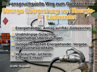 Damit dieser aufwändige Verbraucher-Service weder kurze Wege noch schnelle Lieferungen blockiert, hat die Gütegemeinschaft Energiehandel e. V. ein umfangreiches Kontrollsystem mit klar definierter Abfolge aufgebaut: Stellt ein Händler den Antrag auf das RAL-Gütezeichen, muss er sich ab diesem Zeitpunkt wiederkehrenden und unangemeldeten Überprüfungen durch unabhängige Sachverständige stellen. Dabei wird die gesamte Produkt- und Dienstleistungsqualität des Unternehmens streng unter die Lupe genommen. Gibt es keinerlei Mängel, vergibt die Gütegemeinschaft das RAL-Gütezeichen, mit dem der ausgezeichnete Betrieb dann beispielsweise seine Tankwagen versehen kann. Es garantiert dem Kunden einen sicheren Energie-Einkauf ohne Lieferverzögerung, weil die einzelnen Kontroll-Schritte zum Gütesiegel bereits vor der Tour absolviert worden sind.
