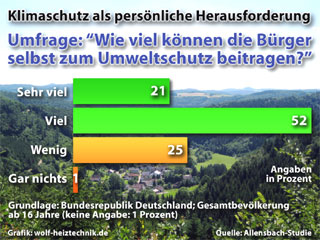 sup.- Politik, Wirtschaft und Bevölkerung können noch viel dazu beitragen, unsere Umwelt und das Klima zu schützen. Davon ist die Mehrzahl der Deutschen überzeugt. Nach einer aktuellen Allensbach-Studie sehen 73 Prozent der Befragten sich auch persönlich herausgefordert: Auf die Frage „Wie viel können die Bürger selbst zum Umwelt- und Klimaschutz beitragen?“ antworten 52 Prozent mit „viel“, weitere 21 Prozent sogar mit „sehr viel“. Wo geeignete Ansatzpunkte für dieses Engagement sind, zeigt ein weiteres Ergebnis der repräsentativen Umfrage: Mit Abstand als wichtigste Maßnahme für den Klimaschutz stufen 93 Prozent der Bevölkerung den Ausbau erneuerbarer Energien ein.