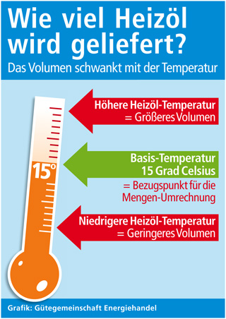 sup.- Auch Energien können wetterfühlig sein: Heizöl dehnt sich bei Hitze aus, bei Kälte dagegen schrumpft das Volumen. Für Hausbesitzer, die zur Wärmeversorgung Heizöl benötigen, kann das unangenehme Folgen haben. Kommt der Tankwagen z. B. an einem heißen Tag, hat die gemessene Liefermenge möglicherweise nur für kurze Zeit Bestand. Nicht etwa, weil sofort etwas verbraucht wird, sondern weil im kühlen Heizungskeller der Tank schon bald weniger Liter enthält, als bezahlt wurden. Um diese dem Kunden verborgene Form der Preiserhöhung auszuschließen, ist die Liefermenge beim Heizöl-Kauf stets auf eine verbindliche Basis-Temperatur umzurechnen: Bezahlt werden muss grundsätzlich nur die Liter-Anzahl, die bei exakt 15 Grad Celsius vorhanden wäre.