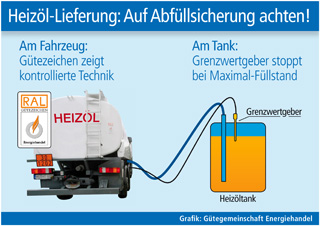 Was aber, wenn diese Abfüllsicherung zwar auf Seiten des Öltanks funktioniert, nicht aber am Tankwagen des Lieferanten? Dessen Wartung kann der Kunde schließlich nicht ebenfalls überwachen. Muss er auch nicht, denn er hat die Möglichkeit, sich einen täglichen Tankwagen-Check gewissermaßen bescheinigen zu lassen: Die Plakette „RAL-Gütezeichen Energiehandel“ am Fahrzeug belegt, dass dieses Lieferunternehmen sich zu Qualitäts- und Sicherheitsstandards verpflichtet hat, die weit über deutsche und europäische Vorschriften hinausgehen. Dazu gehört vor jedem Fahrtantritt neben der gründlichen Kontrolle der Fahrzeugtechnik, der elektrischen Einrichtungen und weiterer sicherheitsrelevanter Ausstattung auch eine Überprüfung der Eichfristen an den Messanlagen. Welchen Brennstoffhändlern das Qualitäts-Siegel bereits verliehen wurde, kann im Internet unter www.guetezeichen-energiehandel.de abgerufen werden.