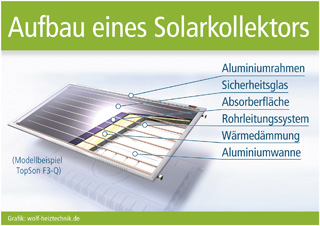 Maßgeblich für die Leistungsfähigkeit moderner Kollektoren sind die Qualität der Materialien und die Art der Konstruktion. Bei den weit verbreiteten Flachkollektoren befindet sich hinter hochtransparentem Sicherheitsglas eine dunkle Absorberfläche, etwa aus Kupfer, die in einem wärmegedämmten Gehäuse liegt. Die Wärme der auftreffenden Strahlung kann so nahezu ohne Reflektion an ein integriertes Rohrleitungssystem weitergegeben werden, durch das eine Wärmeträgerflüssigkeit strömt. Sie transportiert die aufgenommene Wärme zu einem Solarspeicher, der sie zur Nutzung bei der Warmwasserbereitung und beim Heizen bereithält. Auch hier kommt es natürlich auf eine optimale Dämmung an, um Energieverluste zu vermeiden.