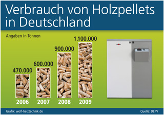 sup.- Der jährliche Verbrauch von Holzpellets in Deutschland hat erstmals die Grenze von einer Million Tonnen überschritten. Von 470.000 t im Jahr 2006 auf insgesamt 1,1 Mio. t in 2009 stieg der Einsatz der kleinen Presslinge mit hohem Heizwert innerhalb von drei Jahren auf nahezu das Dreifache. Damit setzt sich ein Brennstoff für die häusliche Wärmeerzeugung durch, der die Unabhängigkeit von fossilen, importierten Energien mit kostensenkender Effizienz und einem Heizkomfort auf höchstem Niveau verbindet. Inzwischen erlauben Pellets aber nicht nur in Wohngebäuden eine Wärmeerzeugung aus erneuerbaren Energien: Immer mehr kommunale Einrichtungen sind von den Vorteilen der Energieträger aus eigenen Landen ebenfalls überzeugt und setzen sie zunehmend auch in größeren Gebäuden wie Stadthallen, Schulen oder Kindergärten ein. Prognosen von Fachleuten sagen für das Jahr 2010 einen weiteren Verbrauchsanstieg auf rund 1,3 Mio. t voraus.