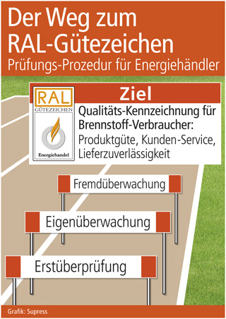 sup.- Energiekauf ist Vertrauenssache, weil weder die Produktgüte noch die Abgabemengen in der Praxis ohne weiteres zu erkennen, geschweige denn detailliert nachzuprüfen sind. Deshalb gibt das RAL-Gütezeichen Energiehandel wertvolle Orientierungshilfe beim Bezug von Brennstoffen. Das Qualitätsprädikat, das nach den Güte- und Prüfbestimmungen des Deutschen Instituts für Gütesicherung und Kennzeichnung e. V. (Sankt Augustin) verliehen wird, dürfen Brennstoffhändler erst nach einem bestandenen, aufwändigen Anerkennungsverfahren führen. Heizöl-Verbraucher haben so beispielsweise die Chance, aus dem unübersichtlichen Lieferanten-Angebot diejenigen auszuwählen, deren Seriosität und Zuverlässigkeit durch die Kontrollen bestätigt wurden. Ob Fahrzeugtechnik oder Mess-Einrichtungen, ob Sicherheitsniveau oder die Einhaltung eichrechtlicher Vorschriften – im gesamten Betriebsablauf werden keinerlei Einschränkungen bei den Qualitäts-Standards akzeptiert.