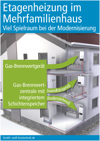 Ein weiterer Vorteil, der bei manchen Modernisierungsplanungen immer noch vernachlässigt wird: In einem Mehrfamilienhaus muss längst nicht jede Etage mit einem identischen Wärmeerzeuger ausgestattet werden. Im Gegenteil: Gerade Gas-Etagenheizungen bieten die Chance, für jede Wohnung eine maßgeschneiderte, auf die jeweilige Nutzung abgestimmte Lösung zu finden – abhängig von der Anzahl der Räume, der Wohnfläche, der Art der Einrichtung, der Bewohnerzahl und anderen Faktoren. So kann z. B. in Eigentumswohnungen jeder Besitzer sein individuelles Wärmekonzept verwirklichen, ohne sich auf Kompromisse einlassen zu müssen. Es gibt nämlich mittlerweile ein reichhaltiges Angebot von Brennwertgeräten, die für dieses Einsatzgebiet geeignet sind und die in Küche, Diele oder Bad zuverlässig ihren Dienst verrichten.