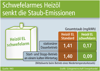 Gewissermaßen als willkommene Begleiterscheinung trägt die schwefelarme Heizöl-Qualität zudem zur Reduzierung der Feinstaubbelastung der Luft bei. Eine mehrjährige Testreihe an der Universität Stuttgart im Auftrag des Instituts für wirtschaftliche Oelheizung e. V. (IWO) hat jetzt bestätigt, dass die Staub-Emissionen umso niedriger ausfallen, je geringer der Schwefelgehalt des Brennstoffs ist. Das zeigte sich im Test sowohl beim Dauerbetrieb als auch noch deutlicher bei einem Start-Stopp-Betrieb, der das reale Verhalten eines Heizkessels an einem kalten Wintertag simuliert. Die durchschnittlichen Gesamtstaub-Emissionen beim schwefelarmen Kesselbetrieb betragen dann nur noch 0,09 mg/kWh, während sie mit herkömmlichem Heizöl bei 1,40 mg/kWh liegen.