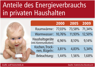Worauf bei einer Sanierung der Heizungsanlage besonders geachtet werden sollte, das zeigt allerdings erst ein genauerer Blick auf die Ergebnisse des Statistischen Bundesamtes. Zwar gehen die absoluten Verbrauchsmengen zurück, aber innerhalb der verschiedenen Anwendungsbereiche von Energie im Privathaushalt verschieben sich die Anteile. Während die Spitzenposition der Raumwärme deutlich an Prozentpunkten verliert, steigt dagegen der Anteil der Warmwasserbereitung langsam, aber stetig an: 2000 betrug dieser Anteil 10,76 Prozent, 2005 bereits 11,93 Prozent und im Jahr 2009 12,5 Prozent. Bei einer Heizungsmodernisierung sollte deshalb auch die Effizienz der Warmwasserbereitung eine wichtige Rolle spielen. Empfehlenswert sind Anlagen mit einem so genannten Schichtenspeicher, der durch raffiniert verteilte Temperaturzonen das Dauerleistungsvolumen enorm verbessert und den Verbrauch minimiert. So ist z. B. vom Systemanbieter Wolf Heiz- und Klimatechnik (Mainburg) ein äußerst sparsames Wandgerät erhältlich, das mit einem kompakten 50-Liter-Speicher eine ununterbrochene Warmwasserkapazität von bis zu 140 Litern bereitstellt. Der Energieverbrauch bleibt dadurch unter Kontrolle, selbst wenn im Badezimmer die Ansprüche an Wellness, Hygiene und regelmäßiges Duschvergnügen weiter steigen.