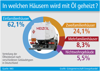 sup.- Die Wärmeenergie Heizöl kommt in Deutschland vor allem bei der Beheizung von Wohngebäuden mit einem oder zwei Haushalten zum Einsatz: 62,1 Prozent aller Ölheizungen stehen in Einfamilienhäusern, weitere 24,1 Prozent in Zweifamilienhäusern. Auf Mehrfamilienhäuser entfällt ein Anteil von 8,3 Prozent und die restlichen 5,5 Prozent der Ölheizgeräte verrichten ihren Dienst in Nichtwohngebäuden, also z. B. in Verwaltungsbauten und gewerblichen Objekten. Diese vom Institut für wirtschaftliche Oelheizung e. V. (IWO) ermittelte Verteilung wird begünstigt durch die Tatsache, dass die aktuelle Ölheiztechnik immer kompakter und platzsparender wird. Leistungsstarke Ölbrennwertkessel lassen sich heute in einer kleinen Nische unterbringen. Und auch die Tanksysteme beanspruchen längst nicht mehr eine ausladende Kellerfläche, sondern lassen sich den räumlichen Gegebenheiten und dem tatsächlichen Energiebedarf entsprechend dimensionieren. Außerdem schätzen zahlreiche Eigenheimbesitzer bei der Ölheizung die Möglichkeit einer Energiebevorratung für lange Zeiträume sowie die Flexibilität bei Bestellmenge und -termin für die Tankneubefüllung.