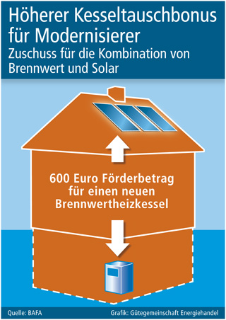 sup.- Durch die Kombination eines Öl-Brennwertheizkessels und einer Solaranlage können Modernisierer heute einen wichtigen Beitrag zur Minderung ihrer Wärmekosten und der Schadstoffemissionen leisten. Denn auch beim Betrieb mit Öl spielt die Brennwerttechnik mittlerweile ihre energieeffizienten Eigenschaften perfekt aus. Aus diesem Grund wurde der Kesseltauschbonus im so genannten Marktanreizprogramm für erneuerbare Energien jetzt unbefristet verlängert und aufgestockt: Wer zusätzlich zur Installation einer Solaranlage seinen alten Heizkessel ohne Brennwertnutzung durch einen neuen Brennwertkessel ersetzt, der erhält seit März 2011 einen Zuschuss von 600 Euro (früher 400 Euro). Gefördert wird das leistungsstarke Wärme-Doppel aus Heizkessel und Sonnenenergie allerdings nur, wenn die Solaranlage sowohl für die Warmwasserbereitung als auch für die Heizungsunterstützung geeignet ist. Eine weitere Voraussetzung für die Summe ist die Antragstellung bis zum Ende des Jahres 2011. Bei späteren Maßnahmen sinkt dann der Förderbetrag auf 500 Euro. Nähere Informationen zu den Konditionen des Kesseltauschbonus gibt es unter www.bafa.de.