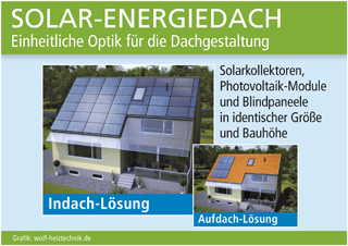 Bei der kompletten Indach-Systemlösung bildet das Solar-Energiedach eine kosteneffektive Alternative zur herkömmlichen Dachbedeckung. Die Module werden dabei an einer wasserdichten, mit Aluminiumankern fixierten Rollmatte montiert. Wer nur einen Teil des Dachs solarenergietechnisch nutzen möchte, kann sich auch für die Aufdach-Lösung entscheiden. Sie erlaubt eine flexible Montage der Module auf den vorhandenen Dachziegeln mit robusten Halteklammern. Die identische Bauhöhe der kompletten Solarmodulfläche sorgt auch hier für eine einheitliche Optik. Weitere Informationen zum Solar-Energiedach gibt es im Internet unter www.wolf-heiztechnik.de.