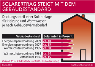 Die Ergiebigkeit solcher Kombi-Solarsysteme wächst mit verbessertem Dämmstandard und sinkendem Gebäudewärmebedarf. Nach Angaben des Bundesindustrieverbandes Deutschland Haus-, Energie- und Umwelttechnik e. V. (BDH) liegt der solare Deckungsbetrag einer Anlage für Heizung und Warmwasser bei Häusern, die der Wärmeschutzverordnung (WSchVo) von 1984 entsprechen, bei ca. 20 Prozent. Werden in dem typischen Beispielhaus mit 15 m2 Kollektorfläche und 1.000-Liter-Kombispeicher die Werte der WSchVo 1995 erreicht, trägt die Sonne schon einen Anteil von rund 30 Prozent bei. Und wer heute ein Wohnhaus nach den bautechnischen Anforderungen der Energieeinsparverordnung (EnEV) 2009 errichtet, der kann bis zu 40 Prozent der gesamten Wärmeerzeugung ohne Energiekosten-Rechnung von der Sonne erledigen lassen.