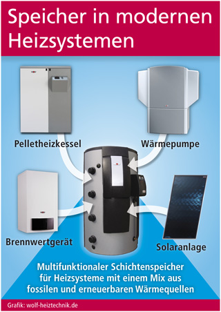 Bei den multivalenten Heizungssystemen mit unterschiedlichen Energiequellen kommt dem Speicher eine besonders wichtige Aufgabe zu. Denn z. B. das von einer Solaranlage gesammelte Wärmepotenzial soll in vielen Fällen erst dann genutzt werden, wenn die Sonne längst nicht mehr scheint. Und in einem Biomasse-Heizkessel entsteht beim Niederbrennen des Brennholzes oftmals mehr Wärme als aktuell benötigt wird. Hier geht es also darum, die überschüssige Wärmemenge in einem Pufferspeicher möglichst vollständig und lange zu bewahren. Außerdem sollte eine raffinierte Verteilung der Temperaturzonen im Speicherinhalt eine Durchmischung verhindern und die Wärmeerträge aus den verschiedenen Quellen stabilisieren. Am besten gelingt dies in multifunktionalen Schichtenspeichern wie z. B. dem Modell BSP des Systemanbieters Wolf Heiz- und Klimatechnik (Mainburg). Solche Geräte verbessern die Gesamteffizienz eines Systems, weil sie sich auf alle Kombinationen aus Energiequelle und Art der Wärmeerzeugung einstellen können. Schichtenspeicher erzielen eine wesentlich höhere Wärmeleistung als herkömmliche Warmwasserspeicher bei gleichem Volumen. Detaillierte Informationen zum technischen Stand der Wärmespeicherung gibt es im Internet unter www.wolf-heiztechnik.de.