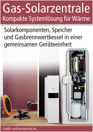 sup.- Ein gewichtiger Pluspunkt in der technischen Gebäudeausstattung eines Wohnhauses: Ist ein Gasanschluss vorhanden, bietet dies grundsätzlich die Chance auf eine äußerst komfortable, platzsparende und saubere Heiztechnik. Kein Wunder, dass rund drei Viertel aller neu installierten Wärmeerzeuger in Deutschland mit diesem Energieträger betrieben werden. Die Gasversorgung der häuslichen Heizung kann aber auch ein Schlüssel zur Nutzung der kostenlosen Sonnenenergie sein. Was zunächst wie ein Widerspruch klingt, hat sich für viele Bauherren und Hausbesitzer längst als ideale Wärmelösung herausgestellt – vor allem dort, wo nicht unbegrenzt Platz für technische Anlagen zur Verfügung steht. Denn ein zusätzlicher Wärmeerzeuger, der ja trotz Solarkollektoren zumindest in den Wintermonaten immer noch erforderlich ist, kann beim Betrieb mit Gas besonders klein und handlich ausfallen. Und inzwischen sind moderne Gasbrennwertkessel so kompakt, dass sie sogar mit den Komponenten einer Solaranlage samt Speicher in einer gemeinsamen Geräteeinheit Platz finden. Eine praktische Planungsoption – besonders für Neubauten, deren Kellerfläche nicht von mehreren sperrigen Geräten belegt werden soll.