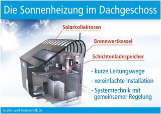 Kollektoren, Kessel und Speicher müssen aber im Team arbeiten, damit die solaren Erträge am effektivsten genutzt werden können. Beim zeitgemäßen Konzept einer „Sonnenheizung“ aus aufeinander abgestimmten Komponenten (z. B. vom Systemanbieter Wolf Heiz- und Klimatechnik, Mainburg) versorgen sowohl der Heizkessel als auch die Solaranlage den Speicher mit Wärme. Der Kessel arbeitet jedoch automatisch immer nur dann und nur so lange, wie die Kollektoren nicht genügend Sonnenstrahlung aufnehmen. Dafür sorgt die gemeinsame Hightech-Regelung des ganzen Systems. Es bietet sich also bei der Planung einer Gebäudesanierung oder eines Neubaus an, den Anlagenkomponenten solch einer Sonnenheizung das Teamwork durch eine örtliche Zusammenführung zu erleichtern. Und da es keinen Sinn macht, die Kollektoren in den Keller zu schicken, ist ein gemeinsamer Einbau des gesamten Systems im Dachgeschoss grundsätzlich eine empfehlenswerte Planungsoption. Mit den heutigen kompakten Brennwert-Wandgeräten und den platzsparenden Schichtenladespeichern ist dies auch in Einfamilienhäusern problemlos realisierbar. Die Leitungswege bleiben dann extrem kurz, was die Installation vereinfacht und beim Betrieb Übertragungsverluste vermeidet. Sämtliche Heizkörper und Wasserentnahmestellen des Hauses werden bei dieser Systemlösung gemeinsam von oben versorgt – und für eine lange Phase des Jahres sogar kostenlos von ganz oben durch die Sonne.