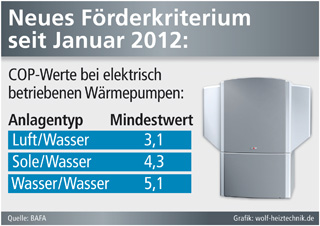 sup.- Mit einer Wärmepumpe kann die in der Luft, im Wasser oder im Erdreich gespeicherte Umweltenergie für die Gebäudebeheizung genutzt werden. Das schont Brennstoff-Ressourcen und mindert die Schadstoff-Emissionen. Die Installation einer Wärmepumpe wird deshalb im Rahmen der Förderung erneuerbarer Energien durch staatliche Mittel bezuschusst. Die Richtlinien für diese Förderung haben sich seit Anfang 2012 geändert: Die Jahresarbeitszahl der Anlagen bleibt das entscheidende Kriterium, aber nun muss zusätzlich je nach Anlagentyp ein bestimmter COP-Wert erfüllt sein. Dieses Kürzel steht für „Coefficient of Performance“ und drückt den Wärmeertrag im Verhältnis zur aufgenommenen Leistung aus. Der COP-Wert 4,0 einer elektrisch betriebenen Wärmepumpe besagt beispielsweise, dass aus der erforderlichen Antriebsleistung ein Vierfaches an Wärmeleistung resultiert.