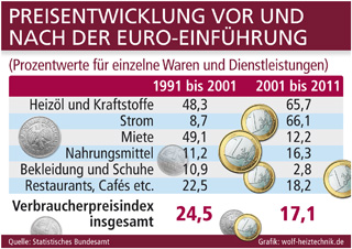 sup.- Euro gleich Teuro? Zehn Jahre nach der Bargeldeinführung der neuen Währung in Deutschland sind viele Menschen davon überzeugt, dass sich die Verbraucherpreise seitdem ungebremst nach oben entwickeln. Zum Teil handelt es sich dabei allerdings eher um eine gefühlte als um eine reale Tendenz. Denn eine vergleichende Übersicht des Statistischen Bundesamtes belegt: Die Preisentwicklung ist seit dem Euro-Start 2002 moderater ausgefallen als beispielsweise in den zehn Jahren davor. Während die durchschnittlichen Verbraucherpreise für alle Waren und Dienstleistungen von 1991 bis 2001 noch um 24,5 Prozent nach oben kletterten, verlangsamte sich der Preisanstieg seitdem bis zum heutigem Stand auf 17,1 Prozent.