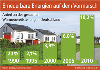 sup.- Die Erzeugung von Wärme erfordert viel Energie und verursacht hohe Kosten. Diese Feststellung hat fast jeder Hausbesitzer oder Mieter schon einmal beim Blick auf seine Brennstoff- bzw. Nebenkostenab-rechnung bestätigen können. Außerdem ist die häusliche Wärmeproduktion der Auslöser von Schadstoff-emissionen, die bei der Verbrennung im Heizkessel entstehen. Diese Negativ-Bilanz lässt sich jedoch deutlich verbessern, wenn bei der Wärmeerzeugung zumindest teilweise erneuerbare Energien eingesetzt wer-den. Klimaschonende Heizungslösungen, die z. B. Sonnen- oder Umgebungswärme integrieren, werden deshalb schon seit längerem durch staatliche Fördermittel unterstützt. Eine Strategie, die allmählich Früchte trägt: Nach den aktuellen Erhebungen der Arbeitsgruppe Erneuerbare Energien-Statistik (AGEE-Stat) im Bundesumweltministerium beträgt der Anteil erneuerbarer Energien an der gesamten Wärmebereitstellung in Deutschland mittlerweile 10,2 Prozent (Datenstand 2010). Ein Blick zurück belegt, welche Dynamik diese Entwicklung gerade in den letzten Jahren bekommen hat. Während der Anteil der regenerativ erzeugten Wärme 1990 mit 2,1 Prozent und auch noch zehn Jahre später mit 3,9 Prozent keine nennenswerte Rolle spielte, erreichte der Wert 2005 schon sechs Prozent und hat inzwischen die Zehn-Prozent-Hürde genommen.