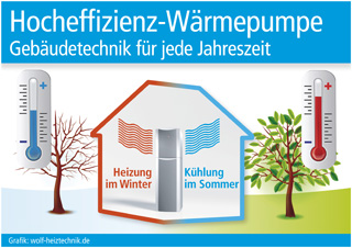 So ist eine Hocheffizienz-Wärmepumpe des Systemanbieters Wolf Heiz- und Klimatechnik (Mainburg) erhältlich, die diesen zusätzlichen Aufgabenbereich einfach durch Zuschaltung eines speziellen Kühlmoduls übernehmen kann. Das Hightech-Zubehör nutzt die tief ins Erdreich verlegte Sonde der Sole-/Wasser-Wärmepumpe für die so genannte passive Kühlung. Damit wird der praktische Effekt bezeichnet, dass sich auch bei großer Hitze die angenehm kühlen Temperaturen aus dem Erdreich ohne weitere Energiezufuhr auf die Luft im Gebäudeinneren übertragen lassen. Im Gegensatz zu konventionellen Klimaanlagen, die zum Betrieb jederzeit Strom benötigen, ist dies also eine wesentlich kostengünstigere Kühlmethode. Für den Hausbesitzer ergibt sich aus der Doppelfunktion der Wärmepumpe eine noch schnellere Amortisation seiner Investitionen, weil die dauerhaft beschäftigte Anlage während des ganzen Jahres zur Reduzierung der Nebenkosten beiträgt.
