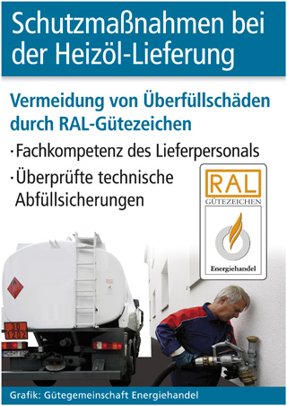 sup.- Damit bei der Heizöl-Lieferung nichts außerhalb des Tanks landet, gibt es zwei wichtige Voraussetzungen: die fachliche Kompetenz des Lieferpersonals und die uneingeschränkte Funktionsfähigkeit der technischen Geräte. Wer darauf nicht achtet, riskiert das Überlaufen des Öltanks und damit hohe Kosten für eine Spezialreinigung seines Kellers. Praktischerweise wird die Sorgfaltspflicht von Hausbesitzern mit Ölheizung seit einigen Jahren durch eine Gütekennzeichnung für Heizölhändler erheblich erleichtert: Anbieter, die das RAL-Gütezeichen Energiehandel führen dürfen, haben sich zu Qualitäts- und Sicherheitsstandards verpflichtet, die weit über die deutschen und europäischen Vorschriften hinausgehen. Die Fahrzeug- und Liefertechnik wird vor jedem Fahrtantritt gründlich begutachtet, unangemeldete Prüfungen durch externe Sachverständige ergänzen dieses Kontrollprogramm. So unterliegt auch die automatische Abfüllsicherung, die die Ölzufuhr bei Erreichen des maximalen Füllstands im Tank unmittelbar stoppt, einer kontinuierlichen Überwachung.