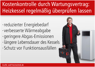 Die einfachste Methode, dieser gesetzlichen Vorgabe nachzukommen, ist der Abschluss eines Wartungsvertrages. Der beauftragte Heizungsfachbetrieb übernimmt dann die jährliche Überprüfung und Reinigung der Anlage sowie gegebenenfalls die Neu-Justierung der Regelungsparameter. Je nach Hersteller der Heizung kann der Wartungsvertrag mittlerweile auch Basis für eine umfassend erweiterte Geräte-Gewährleistung sein. So können Heizungsbesitzer beim Systemanbieter Wolf Heiz- und Klimatechnik (Mainburg) jetzt eine fünfjährige Systemgewährleistung auf die Gesamtanlage erhalten. Sie umfasst neben dem Wärmeerzeuger beispielsweise auch Speicher, Regelung, Abgas- und Hydraulikzubehör bzw. eine Solaranlage. Abgesehen von einem bestehenden Wartungsvertrag ist die Voraussetzung für dieses Angebot, dass alle verbauten Komponenten Wolf-Produkte sind und die Inbetriebnahme von einem Fachhandwerker oder dem Werkskundendienst durchgeführt wurde. Detaillierte Informationen zur 5-Jahre-Systemgewährleistung gibt es im Internet unter www.wolf-heiztechnik.de.