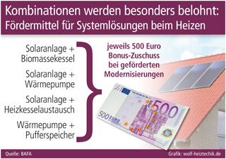So gibt es zusätzlich zur so genannten Basisförderung einen Bonus von 500 Euro für Maßnahmen, bei denen mit einer Solaranlage gleichzeitig auch eine förderfähige Biomasse- oder Wärmepumpenanlage errichtet wird. Eine andere Art von Zusammenspiel fördert der Kesseltauschbonus. Er beträgt ebenfalls 500 Euro und wird gewährt, wenn im Rahmen der Installation einer Solaranlage ein herkömmlicher Heizkessel durch ein modernes Brennwertgerät ersetzt wird. Um 500 Euro kann sich auch die Wärmepumpen-Förderung erhöhen: Hier gibt es den Bonus-Zuschuss für die Einbeziehung eines Pufferspeichers in das Modernisierungskonzept. Alle Bonus-Varianten aus diesem Fördertopf sind miteinander kombinierbar und schaffen so dem Hausbesitzer finanzielle Spielräume für seinen Umstieg auf ein individuelles Wärme-Gesamtsystem.