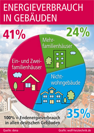Leider gibt es immer noch zahlreiche Eigentümer, die sich von solchen Zahlen nicht betroffen fühlen. Gespart werden muss vor allem in großen Verwaltungs- und Industriegebäuden, so eine weit verbreitete Fehleinschätzung. Dabei haben Ein- und Zweifamilienhäuser mit 41 Prozent den höchsten Energieverbrauch unter den Gebäudetypen. Weitere 24 Prozent entfallen auf die Mehrfamilienhäuser und mit 35 Prozent sind Nichtwohngebäude lediglich für ein gutes Drittel des Energieverbrauchs verantwortlich. Das ergibt sich aus dem aktuellen Gebäudereport der Deutschen Energieagentur (dena), für den etliche repräsentative Fakten über die Energieeffizienz im Gebäudebestand ermittelt wurden. Heizungssanierungen in Ein- und Zweifamilienhäusern, bei denen veraltete und überdimensionierte Heizkessel durch moderne Wärmeerzeuger ersetzt werden, sind deshalb für die Energiewende unverzichtbar. Einen anschaulichen und umfassenden Überblick über moderne Varianten der Wärmeerzeugung gibt es auf der Internetseite des Systemanbieters Wolf Heiz- und Klimatechnik (Mainburg, www.wolf-heiztechnik.de). Dort finden Eigentümer auch praktische Hinweise zur Ermittlung des individuellen Einsparpotenzials. Denn Heizungsmodernisierungen, z. B. durch effiziente Brennwerttechnik in Kombination mit erneuerbaren Energiequellen, minimieren nicht nur die Schadstoff-Emissionen. Auch die Heizkosten sinken deutlich, wenn Wärmeerzeuger nach dem heutigen Stand der Technik installiert werden.