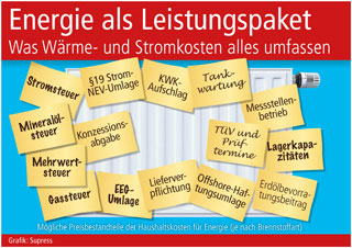 sup.- Der Kauf von Energie ist fürs Wohnen unverzichtbar und beeinflusst maßgeblich die Höhe der Nebenkosten. Aber kaum einem Strom-, Gas- oder Heizölkunden ist im Detail bekannt, wofür er dieses Geld überhaupt ausgibt. Denn nur ein kleiner Teil der jeweiligen Abrechnung des Versorgungsunternehmens bezieht sich tatsächlich auf den Bezug von Brennstoff bzw. auf die eigentliche Stromproduktion. So entfallen mittlerweile rund 68 Prozent der Kosten für Elektrizität in einem durchschnittlichen Haushalt auf die so genannten Netzentgelte für die Nutzung der Leitungen sowie auf staatliche Steuern, Abgaben und Umlagen. Darin sind dann neben der Mehrwertsteuer auch unbekanntere, aber in der Rechnung dennoch spürbare Posten wie Stromsteuer, Konzessionsabgabe, KWK-Aufschlag, EEG-Umlage, § 19 StromNEV-Umlage und seit Anfang 2013 eine Offshore-Haftungsumlage enthalten. Allein diese vom Staat erhobenen Kostenanteile haben sich in den vergangenen 15 Jahren nach Angaben des Bundesverbandes der Energie- und Wasserwirtschaft (BDEW) um 179 Prozent verteuert.