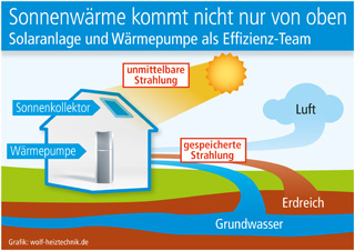 Was bei der Bau- und Sanierungsplanung jedoch häufig unberücksichtigt bleibt: Nicht nur die direkte Wärme von oben kann für Heizung und warmes Wasser sorgen, sondern auch die Sonnenenergie, die auf natürliche Weise gespeichert bleibt. Diese so genannte Umgebungswärme ist ein wertvolles Reservoir, das ebenso zu einer Minimierung von Energieverbrauch und Schadstoff-Emissionen beitragen kann wie die unmittelbare Sonnenstrahlung. Leistungsstarke Wärmepumpen sind in der Lage, die Luft, das Erdreich oder das Grundwasser selbst dann als ergiebige Wärmequellen zu nutzen, wenn in der kalten Jahreszeit die Sonne schon seit Wochen nicht mehr zu sehen war. Sogar bei winterlichen Minustemperaturen können solche Geräte aus den natürlichen Wärme-Depots noch Energie für die Gebäudeversorgung gewinnen.