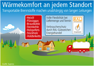 Aus diesem Grund entscheiden sich viele Bauherren und Modernisierer inzwischen bewusst für ein leitungsunabhängiges Wärmekonzept, z. B. mit Heizöl, Holzpellets bzw. anderen Biomasse-Produkten oder dem transportablen Flüssiggas. Heizungsanlagen, die mit diesen Brennstoffen betrieben werden, lassen sich heute zudem meist problemlos mit einer ebenso leitungsunabhängigen Solaranlage kombinieren. Auf diese Weise sind zeitgemäßer Wärmekomfort und höchste Energieeffizienz an jedem gewünschten Gebäudestandort möglich, auch außerhalb der großen Städte und Ballungszentren. Die Nutzer dieser mobilen Brennstoffe können darüber hinaus von einem besonderen Verbraucherservice profitieren: Das RAL-Gütezeichen Energiehandel ist ein Qualitätsprädikat, das speziell die Hausbesitzer ohne Leitungsnetzanbindung vor unangenehmen Überraschungen bei der Brennstoffbestellung schützt. Die Kennzeichnung wird nur an streng überwachte Anbieter verliehen, die ihre Seriosität sowie die Zuverlässigkeit von Liefertechnik und Zähleranlagen kontinuierlich nachweisen müssen. Die vorgeschriebenen Kontrollen durch unabhängige Sachverständige umfassen neben den Betriebsabläufen des Händlers auch das, was in den Tank des Verbrauchers gefüllt wird: Uneingeschränkte Produktgüte und die Einhaltung aller DIN-Vorschriften sind Voraussetzungen für die Vergabe des RAL-Gütezeichens. Alle Brennstoffhändler, die auf Basis dieser Überprüfungen das Zeichen führen dürfen, lassen sich unter www.guetezeichen-energiehandel.de abrufen.