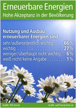 sup.- Trotz aller Diskussionen um den sinnvollsten Verlauf der Energiewende: Die Bundesbürger befürworten mit überwältigender Mehrheit den Umstieg auf regenerative Energien. Das hat jetzt eine repräsentative Umfrage des Meinungsforschungsinstituts TNS Emnid ergeben. Danach halten 93 Prozent der Deutschen den verstärkten Ausbau erneuerbarer Energien für wichtig, sehr wichtig oder außerordentlich wichtig. Lediglich eine kleine Minderheit steht dieser Entwicklung skeptisch bis ablehnend gegenüber. Die „Agentur für Erneuerbare Energien“ (Berlin) weist darauf hin, dass diese Werte die Ergebnisse weiterer vergleichbarer Studien aus den vergangenen Monaten bestätigen. Das Meinungsklima für einen verantwortungsvollen Umgang mit Umweltrisiken und Klimawandel scheint in der Bevölkerung also stabil zu sein.