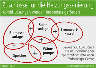 So gibt es z. B. einen so genannten Kombinationsbonus von ebenfalls 500 Euro, wenn eine förder-fähige Solaranlage durch eine Biomasseanlage oder eine Wärmepumpe ergänzt wird. Und die Verknüpfung einer neuen Solaranlage mit dem Umstieg auf einen zeitgemäßen Brennwertheizkessel ist dem BAFA noch einmal 500 Euro als Kesseltauschbonus wert. Experten des Systemanbieters Wolf Heiz- und Klimatechnik (Mainburg) weisen darauf hin, dass solche Kombilösungen ihr Effizienz-Potenzial erst dann voll ausspielen, wenn eine intelligente zentrale Regelungsfunktion die Koordinierung aller Komponenten übernimmt. Unter www.wolf-heiztechnik.de gibt es anschauliche Beispiele für Systemlösungen zur Wärmeerzeugung, die sich in der Praxis unter der Bezeichnung „Sonnenheizung“ bereits vielfach als wirksames Energiespar-Konzept erwiesen haben. Eigentümer finden auf der Website auch einen Überblick über die aktuellen Fördermöglichkeiten sowie über die Voraussetzungen für eine zusätzliche Kesseltauschprämie von Wolf in Höhe von 300 Euro.
