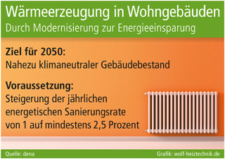 Die Einbindung erneuerbarer Energien zur Wärmeerzeugung ist bei dieser ehrgeizigen Zielsetzung auch in kleineren Eigenheimen unverzichtbar. Dies schränkt den Planungsspielraum von Architekten und Bauherren keinesfalls ein: Die Gebäudetechnik-Experten des Systemanbieters Wolf Heiz- und Klimatechnik (Mainburg) weisen darauf hin, dass es heute eine Vielzahl regenerativer Wärmekonzepte für Ein- und Zweifamilienhäuser gibt. Neben den seit langem praxisbewährten Solaranlagen können beispielsweise auch Biomassekessel oder Wärmepumpen dazu beitragen, den Bedarf an fossilen Brennstoffen in Wohnhäusern zu minimieren (anschauliche Beispiele unter www.wolf-heiztechnik.de). Hocheffiziente Systemlösungen, bei denen alle Gerätekomponenten von einer zentralen Regelung koordiniert werden, machen deshalb nicht nur beim Neubau, sondern gerade auch als Modernisierungsoption Sinn. Damit sich die klimapolitischen Ziele verwirklichen lassen, muss die energetische Sanierungsquote nach Angaben der dena von derzeit jährlich rund einem Prozent auf mindestens 2,5 Prozent steigen.