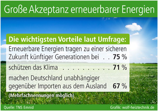 sup.- Ohne eine deutlich erweiterte Nutzung erneuerbarer Energien sind die anspruchsvollen Zielsetzungen der Energiewende nicht realisierbar. Deshalb ist es ein wichtiges Signal, dass die Bundesbürger sich mit großer Mehrheit zum Einsatz von Sonne, Wind und Co. bekennen: In einer repräsentativen Umfrage des Meinungsforschungsinstituts TNS Emnid bezeichnen 92 Prozent der Deutschen den verstärkten Ausbau erneuerbarer Energien als wichtig bzw. sehr oder außerordentlich wichtig. Dabei scheint vor allem die Zukunftsfähigkeit der umweltschonenden Technologien eine Rolle zu spielen. Bei der Frage nach den entscheidenden Vorteilen sind sich mit 75 Prozent die meisten der Befragten darin einig, dass die regenerativen Energien zu einer sicheren Zukunft unserer Kinder und Enkel beitragen. Den Klimaschutz halten 71 Prozent für ein wichtiges Kriterium und die Unabhängigkeit von Energieimporten kommt auf 67 Prozent der Nennungen.