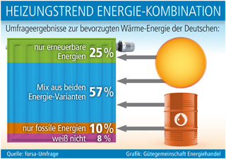 sup.- Die Deutschen entwickeln sich zu Kombinations-Künstlern, wenn es um die Wärme in den eigenen vier Wänden geht. 57 Prozent wünschen sich laut einer repräsentativen forsa-Umfrage eine Heizungsanlage, die mit einem Mix aus konventionellen und erneuerbaren Energien betrieben wird. 25 Prozent der Befragten würden auf die bisherigen Brennstoffe wie Öl und Gas am liebsten ganz verzichten, während lediglich zehn Prozent auch in Zukunft ausschließlich auf diese fossilen Energieträger setzen. Der Trend zum Kombinieren wird forciert durch die staatliche Förderung regenerativer Heizkonzepte, bei denen beispielsweise Solaranlagen oder Wärmepumpen einen Großteil der Heizungs- und Warmwasseraufgaben übernehmen. Die jährlichen Wohnnebenkosten für Energie können durch diese so genannten Hybridsysteme deutlich reduziert werden.