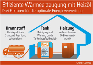Längst nicht jedem Eigentümer ist jedoch klar, dass auch Reinigung und Wartung des Heizöltanks wichtige Vorsorgemaßnahmen sind. Der Alterungsprozess des Öls lässt Sedimente entstehen, die sich am Tankboden ablagern. Gemeinsam mit dem sich dort ebenfalls sammelnden Kondenswasser bilden sie den so genannten Tanksumpf, der keinesfalls in den Brenner der Heizung gelangen darf. Wird dieses Gemisch nicht entfernt, droht außerdem das Risiko von Korrosion und Undichtigkeiten. Ein Schaden am Tank und ein eventuell notwendiger Austausch machen die Effizienz eines zeitgemäßen Brennwertgeräts sofort wieder zunichte. Mit der Wartung des Öltanks sollte nach Auskunft des Bundesverbandes Behälterschutz e. V. (Freiburg) grundsätzlich ein Fachbetrieb nach Wasserrecht beauftragt werden. Das RAL-Gütezeichen Tankschutz und Tanktechnik ist ein zuverlässiger Hinweis darauf, dass ein Betrieb über diese Zulassung und über die notwendige Kompetenz verfügt (www.bbs-gt.de). Wenn Heizkessel und Tank störungsfrei funktionieren, verbieten sich auch Kompromisse bei der Beschaffenheit des Heizöls, dem dritten Faktor für Wärmekomfort. Ölheizungsnutzer haben heute die Auswahl zwischen Standardheizöl, schwefelarmen Sorten sowie Varianten mit speziellen Additiven oder Bio-Anteilen. Hier sollte im Beratungsgespräch mit einem auch in Heizöl-Fragen kompetenten Heizungsfachmann bzw. Energielieferanten abgeklärt werden, welche Ölqualität jeweils am besten geeignet ist.