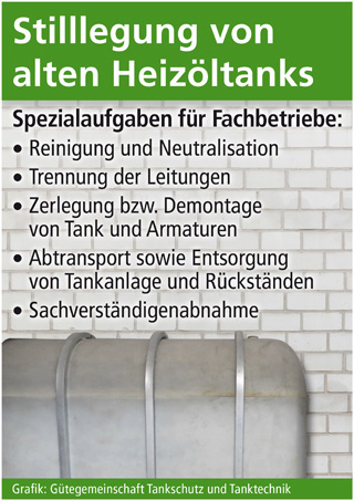 Stillgelegte Anlagen, die zunächst noch nicht entfernt werden sollen, sind gegen versehentliche Befüllung und Inbetriebnahme abzusichern. Verbleibende Erdtanks müssen in manchen Fällen mit festem Material wie z. B. Sand oder Schaumbeton verfüllt werden. Bei einer Demontage werden die Tanks in transportfähige Segmente zerschnitten und anschließend, ebenso wie die ehemaligen Inhaltsstoffe, nach den vorgegebenen Standards entsorgt. Bei Erdtanks und je nach Standort und Größe auch bei oberirdischen Tankanlagen muss die Außerbetriebnahme von einem Sachverständigen überprüft werden. Um diesen Schritt sowie weitere erforderliche Bescheinigungen zur Vorlage bei den zuständigen Behörden kümmert sich der beauftragte Fachbetrieb. Dass es sich um einen zertifizierten Betrieb mit der notwendigen Sachkompetenz handelt, signalisiert das RAL-Gütezeichen Tankschutz und Tanktechnik. Die Qualitätskontrollen durch externe Gutachter, die diese Kennzeichnung voraussetzt, sind noch strenger als es das Gesetz verlangt (www.bbs-gt.de). Mitarbeiter der Fachbetriebe mit Gütezeichen stehen auch als kompetente Berater zur Verfügung, wenn es um eine Umrüstung des alten Behälters geht, beispielsweise zum Wassertank.