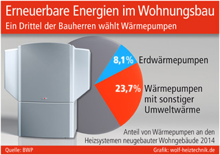 sup.- Für die Wärmeerzeugung in Wohngebäuden spielen erneuerbare Energieträger eine immer größere Rolle. Zwar halten Gasheizungen beim Neubau in Deutschland mit einem Anteil von 51 Prozent noch den Spitzenplatz, aber Wärmepumpen waren im Jahr 2014 mit rund 32 Prozent bereits die zweitbeliebtesten aller installierten Heizungssysteme. Das hat der Bundesverband Wärmepumpe e. V. (BWP) mitgeteilt, der deshalb den Neubaumarkt derzeit als „Zugpferd für die Wärmepumpe“ bezeichnet. Ein zusätzlicher Schub für den Einsatz dieser klimaschonenden Heizungslösung wird von den kürzlich verbesserten Förderkonditionen des staatlichen Marktanreizprogramms (MAP) erwartet. Die Entscheidung für eine förderfähige Erdwärmepumpe wird jetzt beispielsweise mit einem Investitionszuschuss von mindestens 4.000 Euro unterstützt. Nach Angaben des BWP ist die Wärmepumpe in den Bundesländern Thüringen, Sachsen und Saarland bereits die Nummer eins beim Neubau von Wohnhäusern.