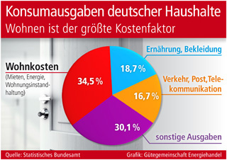 sup.- Mehr als ein Drittel der privaten Konsumausgaben in Deutschland verschlingen die Wohnkosten. Das hat eine aktuelle Erhebung des Statistischen Bundesamtes ergeben. Danach müssen durchschnittlich 34,5 Prozent des Gesamtbudgets in den Haushalten allein für Mieten oder Ähnliches sowie für Energie und Wohnungsinstandhaltung aufgewendet werden. Dieser Bereich hält damit den Spitzenplatz unter den Ausgaben, mit deutlichem Abstand vor dem gemeinsamen Posten Ernährung und Bekleidung, der im Schnitt 18,7 Prozent des Konsums erfordert. Auf Rang drei folgen mit zusammen 16,7 Prozent die Ausgabenanteile für Verkehr, Post und Telekommunikation. Bei dieser prozentualen Verteilung der Kostenfaktoren gibt es mittlerweile kaum noch Unterschiede zwischen den alten und den neuen Bundesländern. Ganze 70 Prozent eines typischen Haushaltsbudgets gelten deshalb im Osten wie im Westen meist als Fixkosten, die sich kaum beeinflussen lassen. Und damit nicht genug: Versicherungsbeiträge oder Kreditzinsen zählen nicht als Konsumausgaben und sind in dieser Statistik noch gar nicht erfasst.