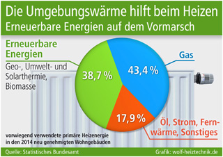 sup.- Gas ist nach wie vor der beliebteste Energieträger für die Heizungsanlagen im deutschen Wohnungsbau. Das hat eine Auswertung der Baugenehmigungen aus dem Jahr 2014 durch das Statistische Bundesamt ergeben. Danach ist in 43,4 Prozent der genehmigten Neubauten eine Gasheizung für den überwiegenden Teil der Wärmeerzeugung zuständig. Der seit Jahren kontinuierlich wachsende Anteil der erneuerbaren Energien kommt dem Spitzenreiter Gas jedoch immer näher: Regenerative Lösungen wie Geo-, Umwelt- und Solarthermie sind mittlerweile schon in 38,7 Prozent der Wohngebäude die Wärmelieferanten erster Wahl. Verantwortlich für diesen Trend ist besonders die effiziente Wärmepumpen-Technologie, die es erlaubt, die im Erdreich, im Grundwasser oder in der Luft konstant gespeicherte Sonnenstrahlung als kostenlose Energiequelle zu nutzen.
