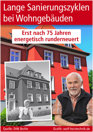sup.- Energieeffizienz als Jahrhundertprojekt für unsere Kinder und Enkel? Diesen zeitlichen Luxus können wir uns angesichts hoher Schadstoff-Emissionen und des fortschreitenden Klimawandels eigentlich nicht leisten. Aber wenn es beim derzeitigen Tempo der energetischen Sanierungen in deutschen Wohngebäuden bleibt, dann muss man leider mit diesen Langzeit-Dimensionen rechnen. Das sind die teilweise überraschenden Erkenntnisse einer Studie, die das Deutsche Institut für Wirtschaftsforschung (DIW Berlin) jetzt vorgestellt hat. Grundlage für den „Wärmemonitor 2014“ war der Datenbestand aus jährlichen Heizenergieabrechnungen für rund 300.000 Gebäude. Nach diesen Daten und einer Abschätzung auf Basis der seit 2009 vorgeschriebenen Energieausweise dauert es derzeit durchschnittlich 75 Jahre, bis ein Mehrfamilienhaus in Westdeutschland einmal vollständig energetisch saniert wurde. Bisher ging man von Sanierungszyklen von rund 55 Jahren aus.