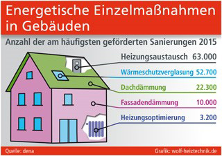 Dass die Unterstützung des Heizungsaustausches am häufigsten beantragt wird, liegt an dem hohen Sparpotenzial bei vergleichsweise überschaubarem Aufwand für diesen Sanierungsschritt. Vor allem die Einbeziehung erneuerbarer Energieträger wie Sonnenstrahlung oder Umgebungswärme in die Gebäudetechnik wirkt sich entlastend auf die Heizkosten aus. Das setzt allerdings voraus, so die dena, dass solche Systeme zur regenerativen Wärmeerzeugung dem jeweiligen Bedarf genau angepasst und richtig kombiniert werden: „Erst im optimierten Zusammenspiel mit allen anderen Komponenten der Heizanlage entfalten sie ihr volles Potenzial und bringen die höchsten Einsparungen.“ Hersteller wie der Systemspezialist Wolf Heiz- und Klimatechnik (Mainburg) bieten deshalb abgestimmte Anlagenpakete aus einer Hand, bei denen die hohe Energieeffizienz aus dem optimalen Zusammenspiel der Geräte resultiert. Hausbesitzer finden unter www.wolf-heiztechnik.de Beispiele für solche zentral geregelten Energiespar-Systeme sowie einen Überblick über die aktuellen Fördermöglichkeiten.