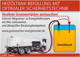 Tankbesitzer, die sich unsicher über die Aktualität ihrer technischen Vorrichtungen sind, sollten sich über mögliche Aus-tauschmaßnahmen informieren lassen. Ein Qualitätsprädikat zeigt bei den Brennstoffhändlern neben anderen Prüfkriterien den Schulungsstand und die Beratungskompetenz der Mitarbeiter an: Das RAL-Gütezeichen Energiehandel wird nur an Lieferanten vergeben, die sich einer neutralen Überwachung ihrer Seriosität und Lieferzuverlässigkeit stellen (www.guetezeichen-energiehandel.de). Diese Kontrollen durch Sachverständige geben dem Heizölkunden ein Optimum an Sicherheit. Denn dort, wo es wie im Fall einer Öltankbefüllung auf die Vermeidung von Bedienfehlern und Betriebsstörungen ankommt, sollten ebenso hohe Ansprüche an die Fachkenntnisse der Lieferanten wie an die uneingeschränkte Funktionsfähigkeit der Technik gestellt werden.