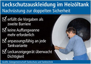 Dies gilt nach Angaben des Bundesverbandes Behälterschutz e. V. (Freiburg) auch für eine weitere Option, um Ölunfälle zuverlässig zu vermeiden: Der Einbau einer flexiblen, maßgeschneiderten Innenhülle als Nachrüstmaßnahme für bestehende Tanks sorgt ebenfalls für die verlangte doppelte Sicherheit – auch bei größeren standortgefertigten Tanks aus Stahl. Dafür verkleiden Experten eines Tankschutz-Fachbetriebs mit wasserrechtlicher Zulassung die Tankinnenfläche nach gründlicher Reinigung zunächst mit einer Zwischenlage aus Vlies. Anschließend wird die neue Hülle aus ölbeständigem Kunststoff montiert. Der große Vorteil dieser so genannten Leckschutzauskleidung: Zwischen beiden Schichten verbleibt etwas Raum, in dem Unterdruck erzeugt wird. Jede Undichtigkeit in einer der beiden Hüllen würde die Druckverhältnisse ändern und sofort zum Alarm eines Leckanzeigegerätes führen.