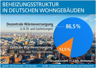 Dank flächendeckend ausgebauter Vertriebsnetze für die Brennstoffe sind auch bei der dezentralen Wärmeversorgung keine Lieferengpässe zu befürchten. Und die Nutzer einer Ölheizung, bei denen die Energie vor Ort gelagert wird, können seit einigen Jahren ein zusätzliches Verbraucherschutz-Instrument in Anspruch nehmen: Das RAL-Gütezeichen Tankschutz und Tanktechnik ist ein Wegweiser zu Fachbetrieben, denen die Verantwortung für Reinigung, Wartung oder Instandsetzung des Öltanks übertragen werden kann. Diese Betriebe haben nach Angaben des Bundesverbandes Behälterschutz e. V. (Freiburg) eine Zulassung nach Wasserrecht und müssen ihre Kompetenz für die Tankschutzmaßnahmen kontinuierlich überwachen lassen (www.bbs-gt.de). Für die Eigentümer bedeutet das: komfortabel heizen mit eigenem Wärmeerzeuger und Brennstofflager, aber ohne zeitlichen Mehraufwand für Tankschutz-Pflichten.