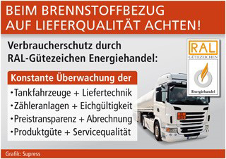 Dass Brennstoffkunden diese Verantwortung heute problemlos wahrnehmen können, liegt an einem leistungsstarken Verbraucherschutzinstrument: Das RAL-Gütezeichen Energiehandel zeichnet Anbieter aus, die sich zu einer konstanten Fremdüberwachung ihrer Lieferqualitäten verpflichtet haben. Nur wenn unabhängige Gutachter die Seriosität und Zuverlässigkeit eines Händlers bestätigen, darf er das Gütezeichen auf Fahrzeugen und Geschäftspapieren führen. Für den Kunden ist das Prädikat ein sicherer Hinweis, dass z. B. die Funktionsfähigkeit und die Eichgültigkeit der Zähleranlagen an den Tankwagen regelmäßig überprüft werden und dass es bei Abrechnung bzw. Lieferscheinausdrucken keine Beanstandungen gibt. Unter www.guetezeichen-energiehandel.de finden Energieverbraucher ein Verzeichnis aller Brennstoff-Lieferanten, denen das RAL-Gütezeichen bereits verliehen wurde.